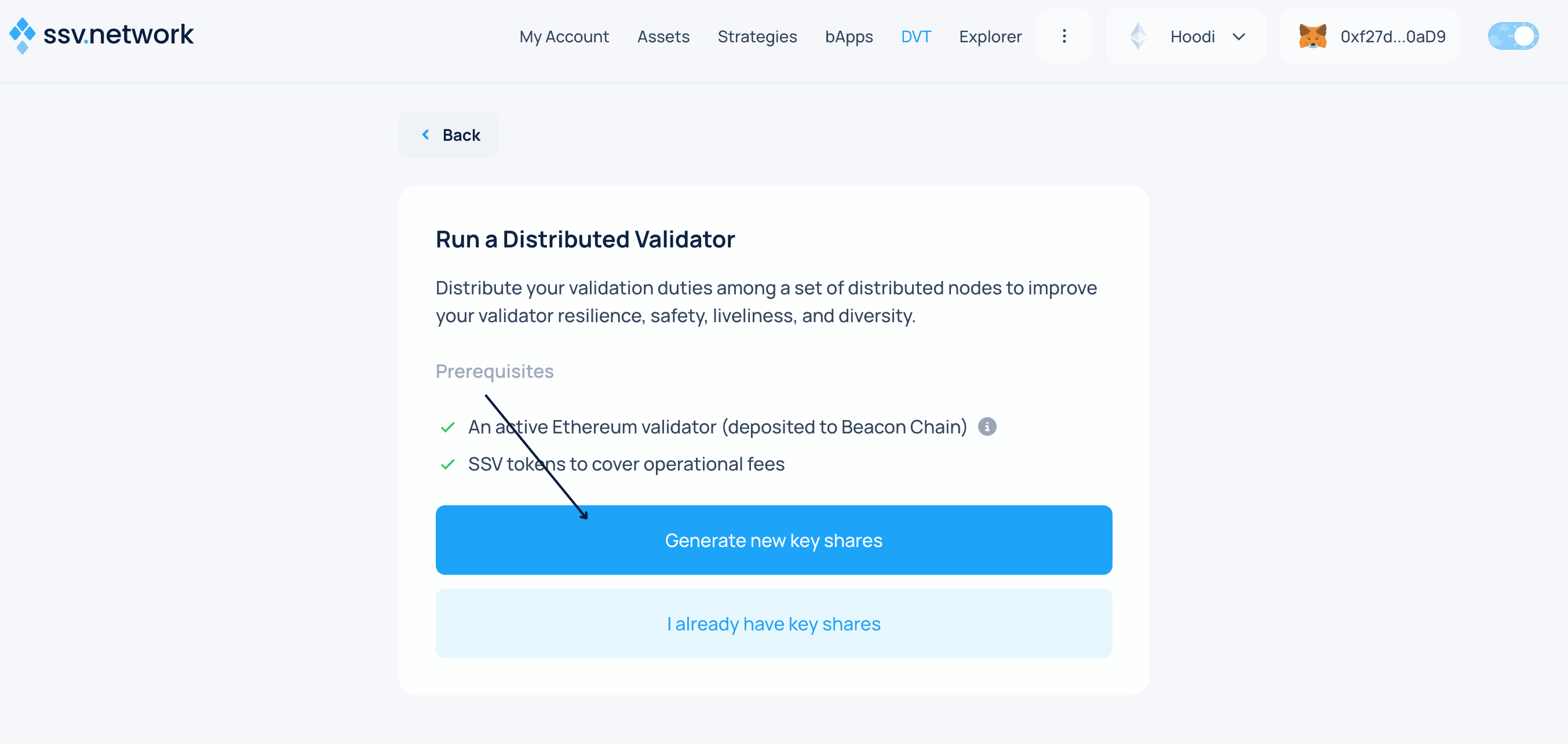 SSV Network ↗ is a permissionless DVT network that provides a simple infrastructure for splitting and distributing a validator key into multiple key shares to run a validator across multiple non-trusting nodes.
