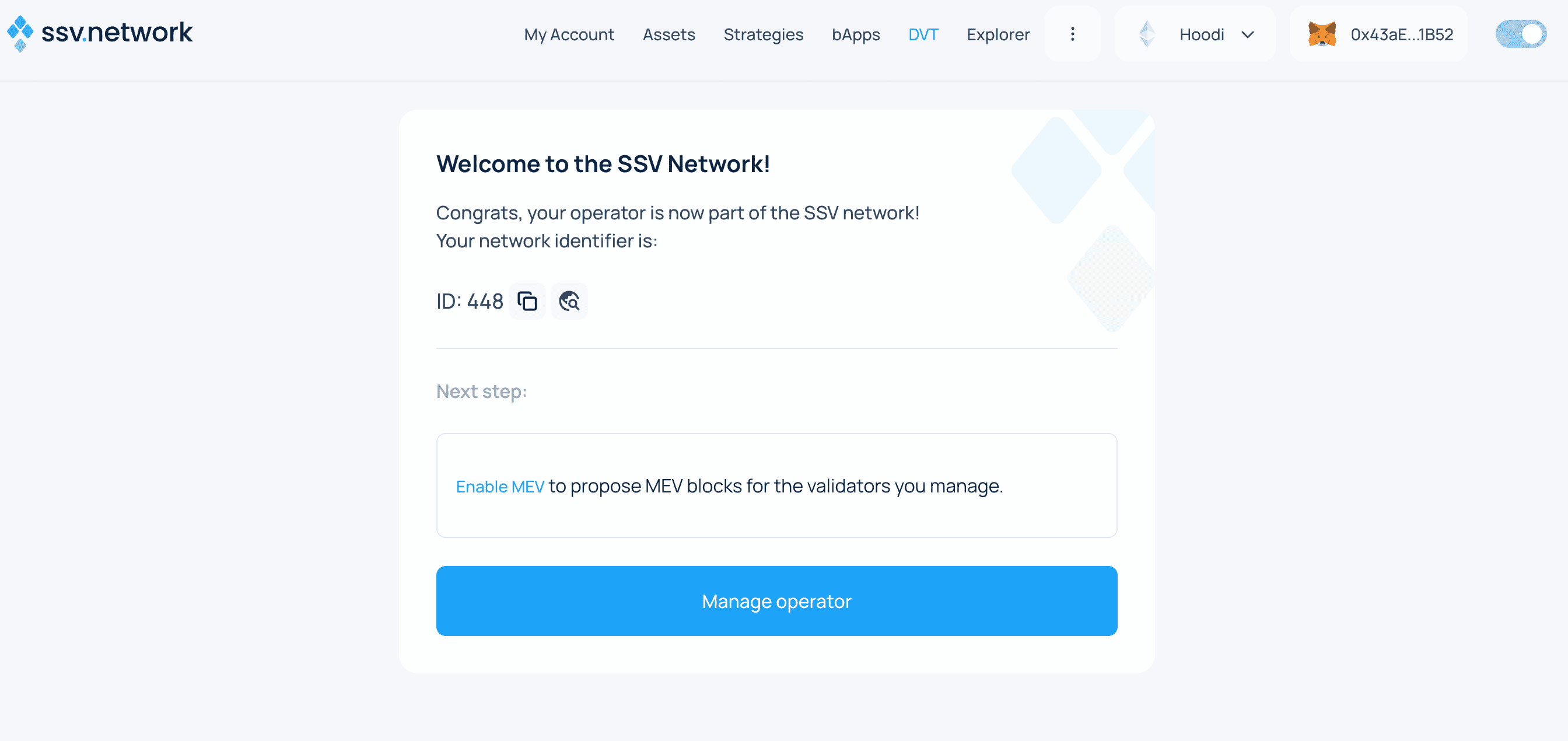 - Congratulations! 🎉 Your validator is now registered on the SSV network and being managed by your selected operators.